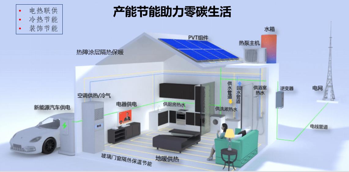 从“电热联供”、“冷热节能”、“装饰节能”三大方面制定产能节能方案,包括热障涂层隔热保暖、PVT组件、热泵主机、水箱、新能源汽车供电、空调供热/冷气、电器供电、供厨房热水、供洗漱热水、供浴室热水、地暖供热、玻璃门窗隔热保温节能等。